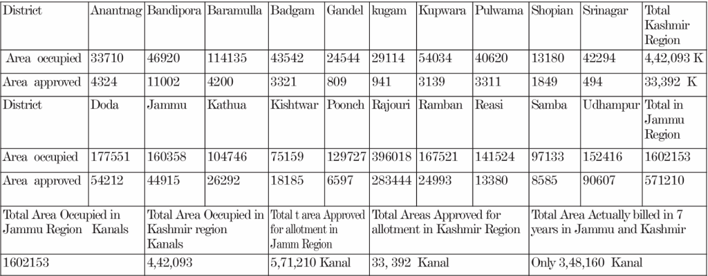 Just to have an broad but immediate idea of the government lands in the possession “unauthorised” it can be well seen from the Table – A below which shows the quantum of the anticipated occupied lands district wise as per reports with the government and the lands that had been cleared by the revenue department for grant of freehold/ ownership rights to illegal occupants / legal occupants ( those who had long official lease ) where from it is quite evident that the ‘beneficiaries’ very very large in number and were spread over whole of J&K ( except Ladakh Region).