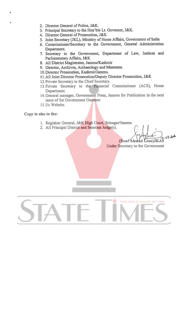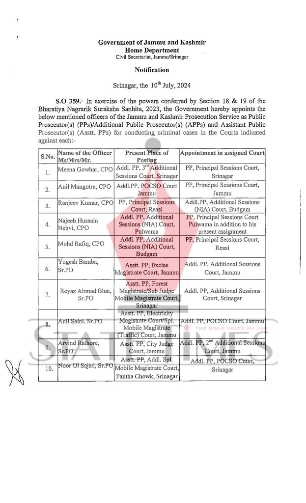 “In exercise of the powers conferred by Section 18 & 19 of the Bharatiya Nagrarik Suraksha Sanhita, 2023, the Government appoints the 22 officers of the Jammu and Kashmir Prosecution Service as Public Prosecutor(s) (PPs)/Additional Public Prosecutor(s) (APPs) and Assistant Public Prosecutor(s) (Asstt. PPs) for conducting criminal cases in the Courts,” read S.O 359 notification issued by Chandraker Bharti, Principal Secretary, Home Department.