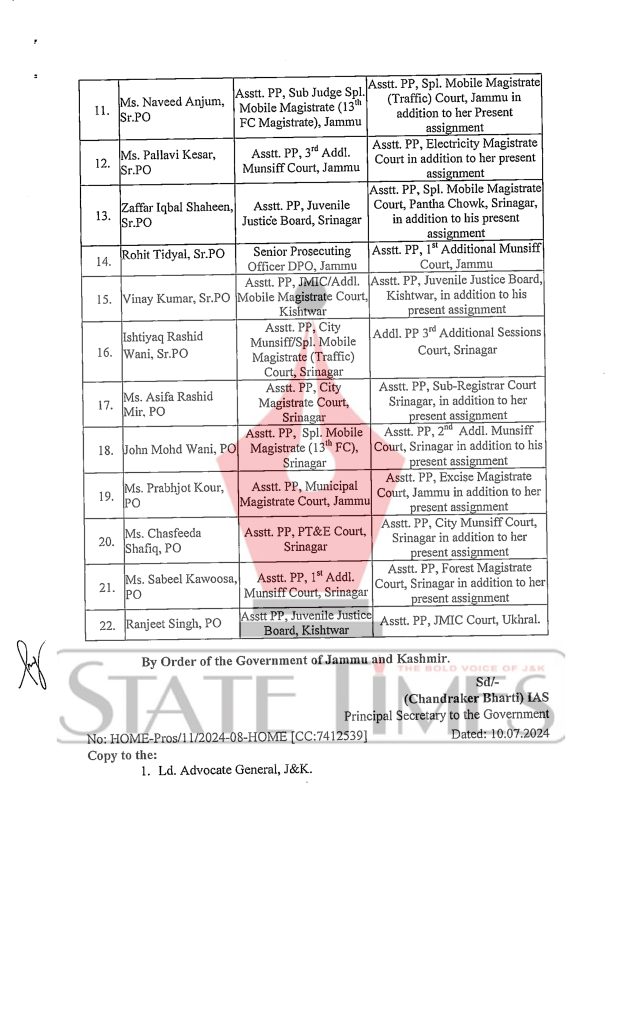 Yogesh Bamba, Sr.PO, Asstt. PP, Excise Magistrate Court, Jammu has been appointed as Addl. PP, Additional Sessions Court, Jammu; Reyaz Ahmad Bhat, Sr.PO, Asstt. PP, Forest Magistrate/Sub Judge Mobile Magistrate Court, Srinagar as Addl. PP, Additional Sessions Court, Srinagar; Anil Saini, Sr.PO, Asstt. PP, Electricity Magistrate Court/Spl. Mobile Magistrate (Traffic) Court, Jammu as Addl. PP, POCSO Court, Jammu; Arvind Rathore, Sr.PO, Asstt. PP, City Judge Court, Jammu as Addl. PP, 2nd Additional Sessions Court, Jammu; Noor Ul Sajad, Sr.PO, Asstt. PP, Addl. Spl. Mobile Magistrate Court, Pantha Chowk, Srinagar as Addl. PP, POCSO Court, Srinagar; Naveed Anjum, Sr.PO, Asstt. PP, Sub Judge Spl. Mobile Magistrate (13th FC Magistrate), Jammu as Asstt. PP, Spl. Mobile Magistrate (Traffic) Court, Jammu in addition to her present assignment; Pallavi Kesar, Sr.PO, Asstt. PP, 3rd Addl. Munsiff Court, Jammuas Asstt. PP, Electricity Magistrate Court in addition to her present assignment; Zaffar Iqbal Shaheen, Sr.PO, Asstt. PP, Juvenile Justice Board, Srinagar as Asstt. PP, Spl. Mobile Magistrate Court, Pantha Chowk, Srinagar, in addition to his present assignment;