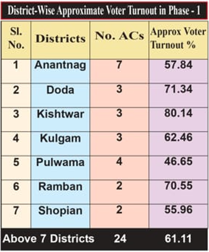 JAMMU: A turnout of about 61.11 per cent — the highest in the past seven elections — was recorded in the first phase of assembly polls in Jammu and Kashmir on Wednesday.