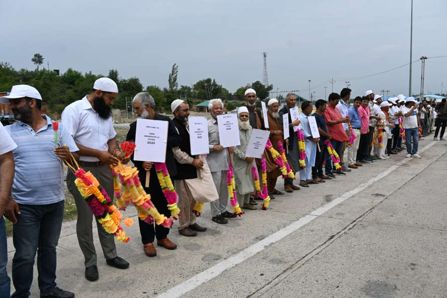 BJP leader Ravindra Raina was also among those who welcomed the yatris with garlands, flower bouquets, sweets, and flower petals.