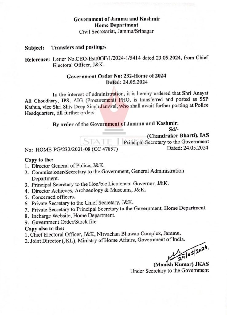 “It is ordered that Anayat Ali Choudhary, IPS, AIG (Procurement) PHQ, is transferred and posted as SSP Kathua vice Shiv Deep Singh Jamwal, who shall await further posting at Police Headquarters, till further orders.” reda an order issued by Chandraker Bharti, Principal Secretary, Home Department.