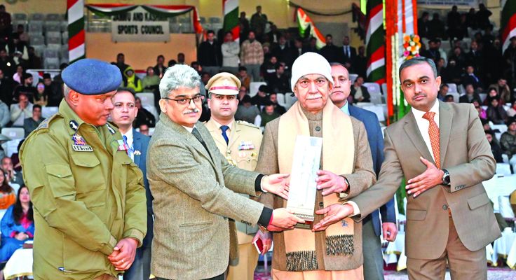 In recognition of their outstanding display and artistry, the Lieutenant Governor felicitated the contingents of Jammu Kashmir Police and Security Forces; Parade Commander, Ex-Servicemen; Pipe and Brass bands, marching contingents (Boys & Girls), daredevils, commentators, cultural performers and best Tableaux. The ceremony also featured the felicitations of winners of the Vande Mataram singing competition and UT-level online essay writing competition organized by the Department of Information and Public Relations.