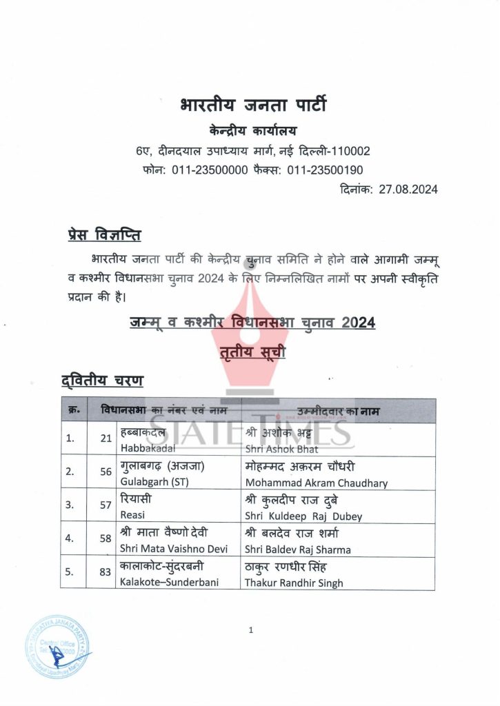 #BJP releases list of candidates for 2nd & 3rd phase of J&K Assembly polls DistrictsImage GalleryJammu By statetimes_editor Last updated Aug 27, 2024 0 2,644 Share 0 2,644 Share FacebookTwitterGoogle+ReddItWhatsAppPinterestEmail
