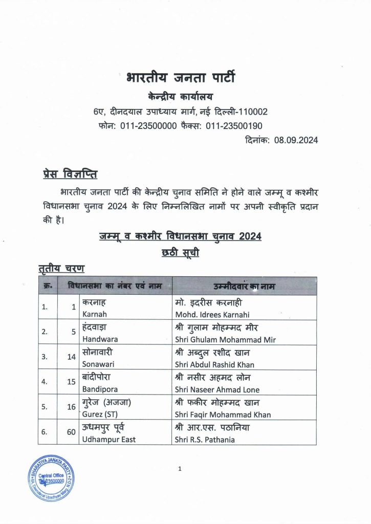 BJP releases sixth list of 10 candidates for J-K assembly polls