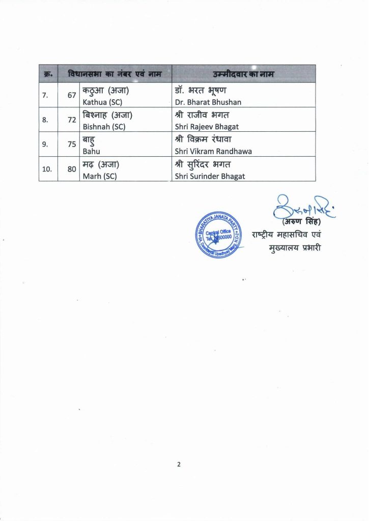 Bharat Bhushan will contest the election from Kathua, Rajeev Bhagat from Bishnah and Surinder Bhagat from Marh. These three assembly seats are reserved for the Scheduled Caste (SC).