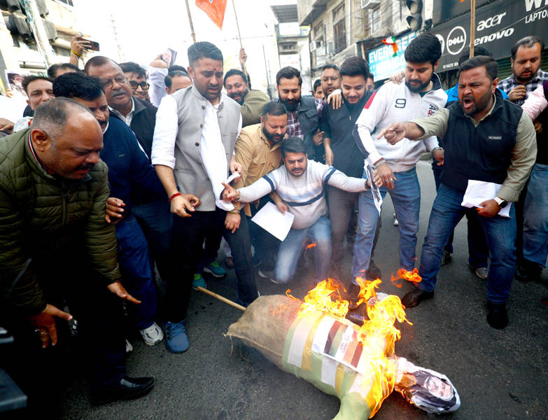 Led by Jammu and Kashmir Bharatiya Janata Yuva Morcha (BJYM) president Arun Prabhat, several dozen protesters gathered at Kachi Chawni Chowk, raised slogans against the Congress, burnt an effigy of Leader of Opposition in the Lok Sabha Rahul Gandhi, and demanded an apology from him for allegedly hurting the “honour, dignity and reputation” of the country.
