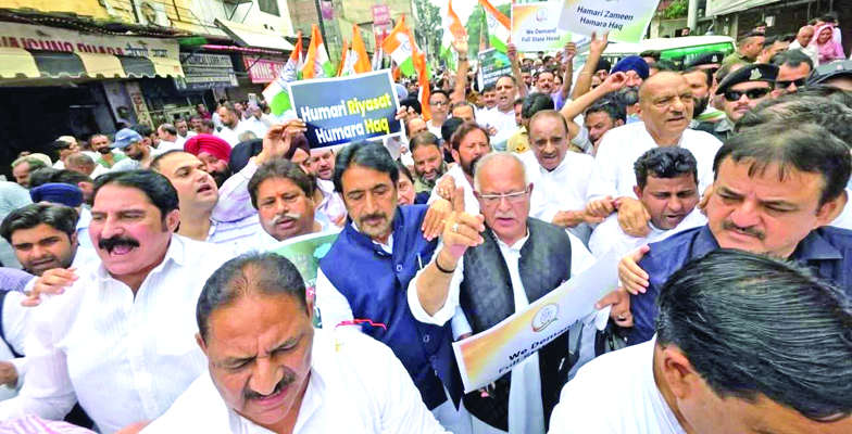The protest march, held from Shaheedi Chowk towards Raj Bhawan, was part of the party’s ongoing campaign for the restoration of full statehood to Jammu and Kashmir under the slogan “Hamari Riyasat, Hamara Haq.”As the protest began from the Congress headquarters, a large number of leaders and workers attempted to march through Residency Road and Raghunath Bazar. However, heavy police deployment stopped the protestors at Shaheedi Chowk. A scuffle broke out as protestors tried to cross barricades. Several managed to breach the blockade before being detained by police and taken to District Police Lines (DPL) Jammu.While most of the protestors were rounded up near the protest site, PCC Chief Karra and a few others advanced further into Raghunath Bazar before also being detained. Other senior leaders, including Ch. Lal Singh, Shah Nawaz Choudhary, Neeraj Kundan, Mula Ram, Th. Balwan Singh, Ravinder Sharma, Indu Pawar, Th. Hari Singh Chib, and several former MLAs, MLCs, DCC presidents, ex-corporators, and Mahila Congress leaders, were among those taken into preventive custody. Addressing reporters before his detention, Karra slammed the central government for “delaying and denying” the promise of statehood, which, he said, was reiterated by the Centre and backed by the Supreme Court. “Congress will continue to fight for the identity, rights, and land of the people of Jammu and Kashmir,” Karra said, adding that Congress leaders Mallikarjun Kharge and Rahul Gandhi have also raised the issue nationally.AICC General Secretary G.A. Mir echoed similar concerns, accusing the Centre of betraying its promise over the last six years and thanked party leadership for supporting the statehood demand ahead of the Parliament’s monsoon session.Karra announced that the party will proceed with its scheduled Delhi Chalo call on Monday afternoon. Congress leaders and workers will travel to Delhi to stage a peaceful protest outside Parliament in support of the demand for full statehood.The Congress also submitted a memorandum to the Prime Minister via the Lieutenant Governor, reiterating their stand on statehood restoration..
