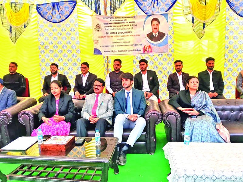 REASI: On the directions of JK Legal Services Authority and under the Chairmanship of Khalil Choudhary, Chairman District Legal Services Authority (DLSA) Reasi (Pr. District & Sessions Judge, Reasi), DLSA Reasi in collaboration with Tehsil Legal Services Committee, Mahore on Saturday celebrated International Women Day. On the occasion, a Legal Awareness Camp was organized at Govt. Higher Secondary School, Reasi under the theme “Give to Gain”.