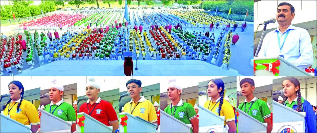 Principal JK Public School Kunjwani, Rajesh Rathore and students addressing morning assembly on Wednesday.