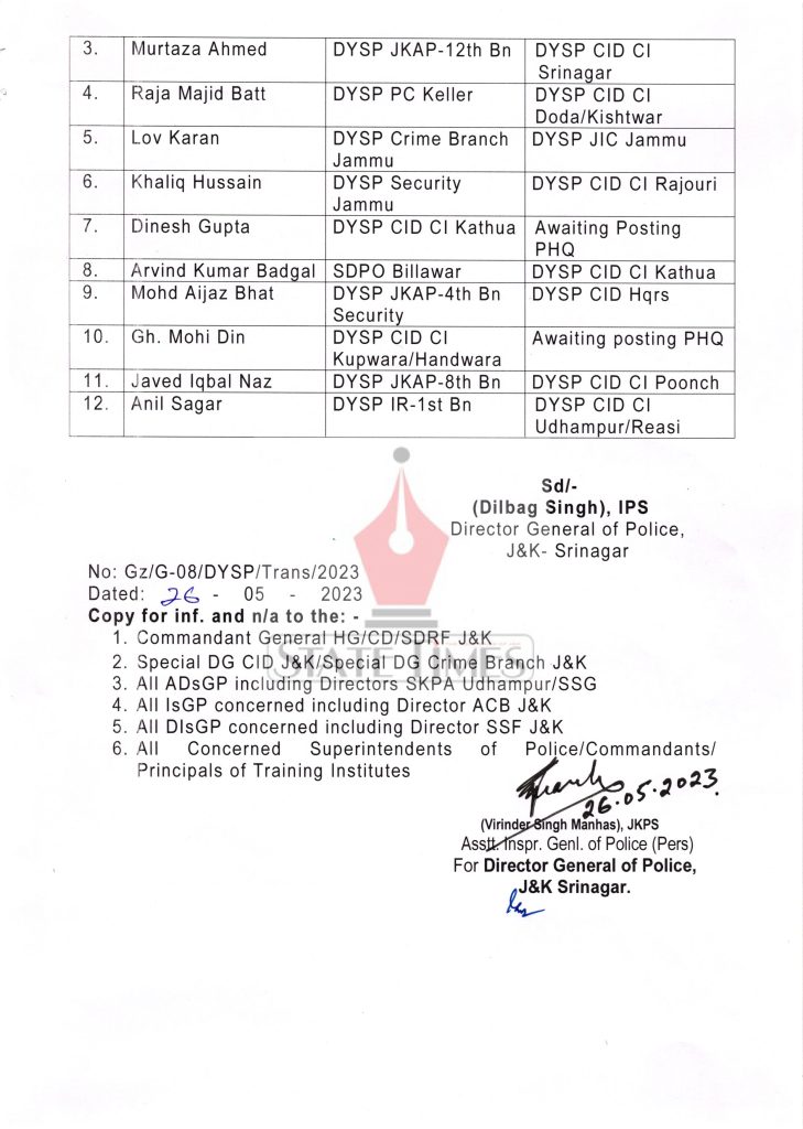 Further, Manish Kumar Sharma, DySP CID CI Rajouri, awaiting posting PHQ; Govind Rattan, SDPO Qazigund has been posted as DySP (A) CID Hqrs; Murtaza Ahmed, DySP JKAP-12th Bn as DySP CID CI Srinagar; Raja Majid Batt, DySP PC Keller as DySP CID CI Doda/Kishtwar; Lov Karan, DySP Crime Branch Jammu as DySP JIC Jammu; Khaliq Hussain, DySP Security Jammu as DySP CID CI Rajouri; Dinesh Gupta, DySP CID CI Kathua, awaiting posting PHQ; Arvind Kumar Badgal, SDPO Billawar as DySP CID CI Kathua; Mohd Aijaz Bhat, DySP JKAP-4th Bn Security as DySP CID Hqrs; Gh. Mohi Din, DySP CID CI Kupwara/Handwara awaiting posting PHQ; Javed Iqbal Naz, DySP JKAP-8th Bn as DySP CID CI Poonch; and Anil Sagar, DySP IR-1st Bn has been posted as DySP CID CI Udhampur/Reasi.