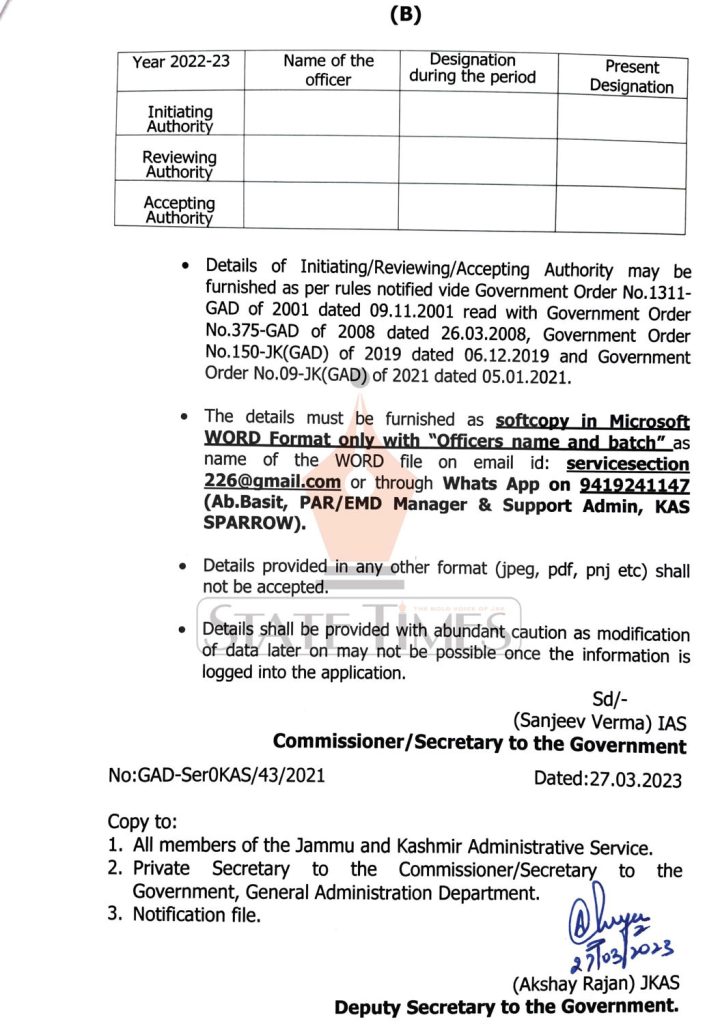 STATE TIMES NEWS Filling of online APRs on SPARROW portal for the Financial Year 2022-23 (1S April, 2022 to 31s March, 2023) is due and accordingly all the members of the Jammu and Kashmir Administrative Service are requested to furnish following details before 28.03.2023 positively so that Blank APRs are generated and sent into their accounts, read notification below: