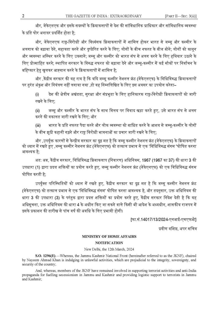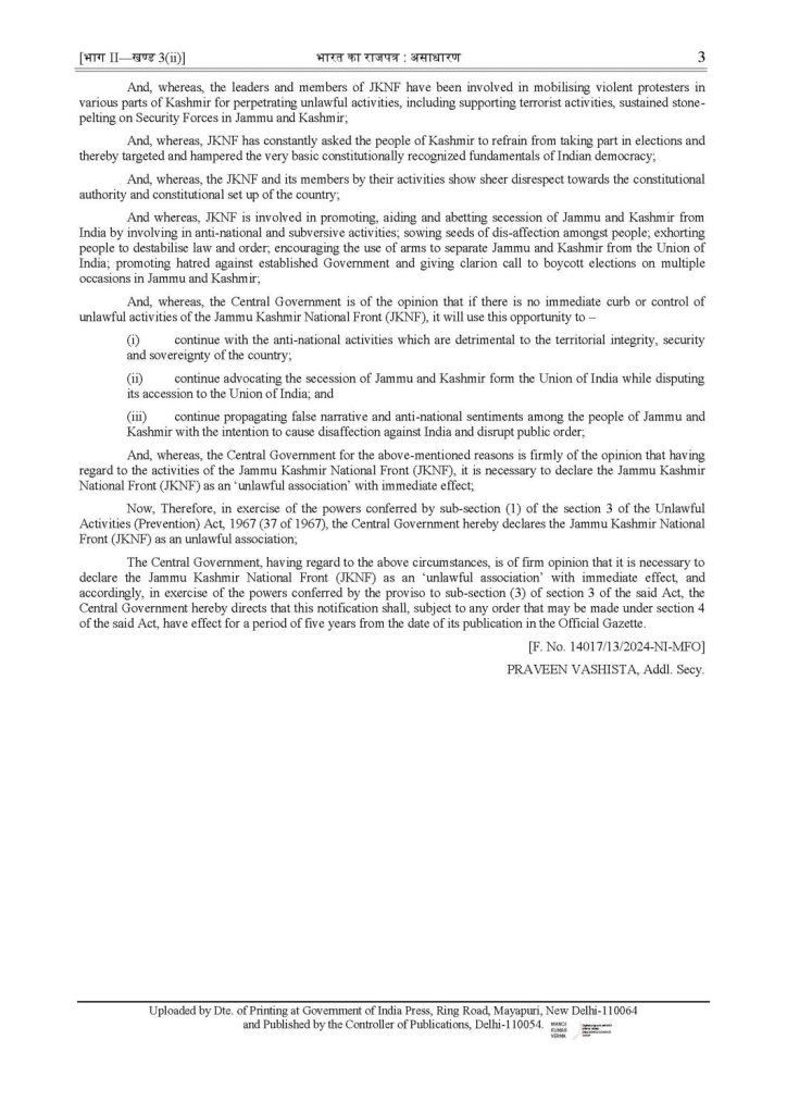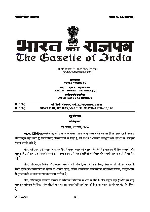 The Modi government today declared Jammu and Kashmir National Front as an Unlawful Association.