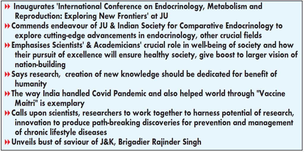 “The way India handled Covid Pandemic and also helped the world through “Vaccine Maitri” is exemplary, the Lieutenant Governor said while inaugurating ‘International Conference on Endocrinology, Metabolism and Reproduction: Exploring New Frontiers’ at University of Jammu.