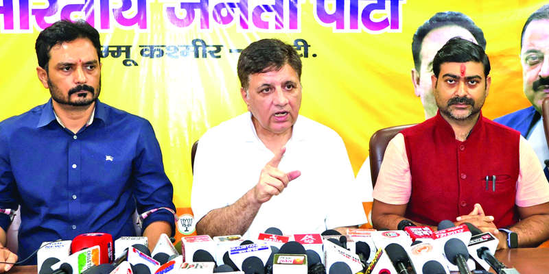 JAMMU: Chief Spokesperson, J&K BJP, Advocate Sunil Sethi, accompanied by Dr. Abhijeet Jasrotia, Spokesperson, and Dr. Pardeep Mahotra, Media Incharge, J&K BJP on Tuesday criticized Chief Minister’s recent actions and statements, calling them a mockery of the law-and-order system. Addressing a press conference at party headquarters, here, Advocate Sunil Sethi said it was shocking to see the CM himself publicly violating laws by climbing over walls to pay tribute to rioters who were killed in the 1931 police firing incident while attacking a Central Jail where anti-national elements were imprisoned.