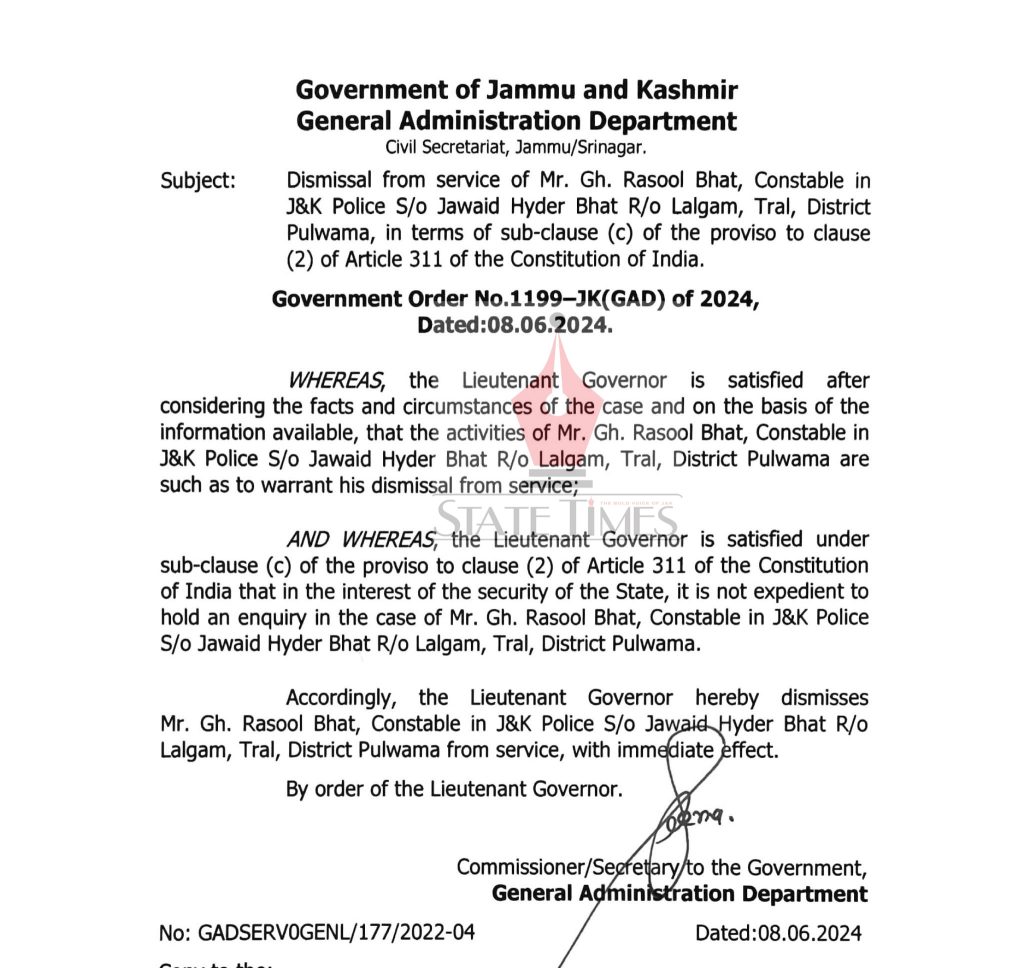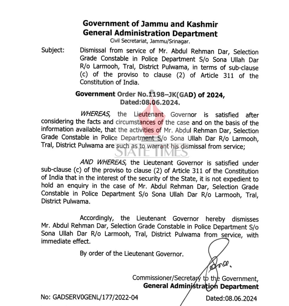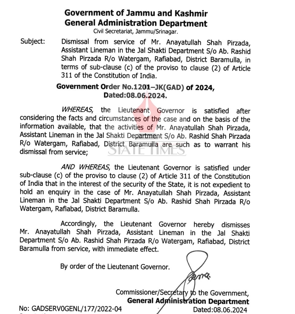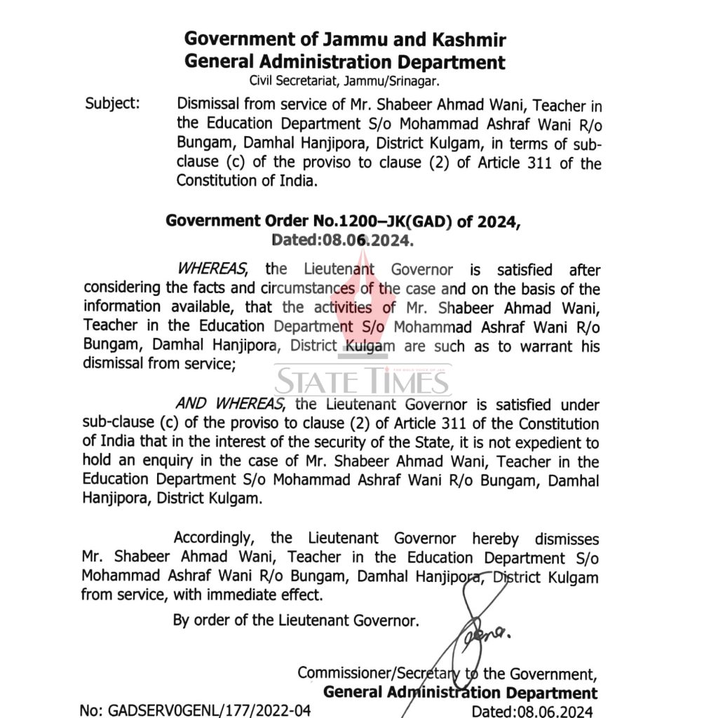 J&K Government dismissed four employees including two cops, a teacher and an assistant lineman in Jal Shakti department over anti-national activities. Image GalleryJammuJammu and Kashmir By statetimes_editor Last updated Jun 8, 2024 0 552 Share 0 552 Share FacebookTwitterGoogle+ReddItWhatsAppPinterestEmail