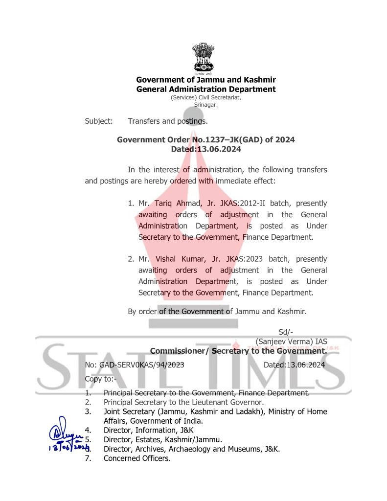 J&K Govt orders transfers and postings of 2 JKAS Officers Image GalleryJammuJammu and Kashmir By statetimes_editor Last updated Jun 14, 2024 0 2,595 Share 0 2,595 Share FacebookTwitterGoogle+ReddItWhatsAppPinterestEmail