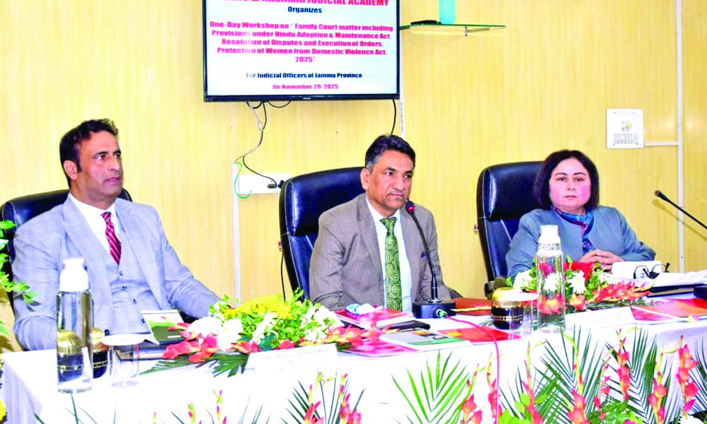 JAMMU: Under the patronage of Justice Arun Palli, Chief Justice, High Court of Jammu & Kashmir and Ladakh (Patron-in-Chief, J&K Judicial Academy), guidance of Chairperson and members of Governing Committee for J&K Judicial Academy, the Jammu & Kashmir Judicial Academy on Saturday organized a one day workshop on “Family Court Matters, including provisions under the Hindu Adoption and Maintenance Act, Guardian and Wards Act, Resolution of Disputes, Execution of Orders and Protection of Women from Domestic Violence Act, 2005” at Janipur, Jammu.
