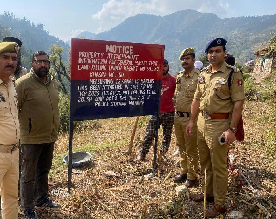 Police attached land measuring more than three kanals at Sildhar village belonging to Sharif Mirasi under Section 25 of the Unlawful Activities (Prevention) Act (UAPA), they said.