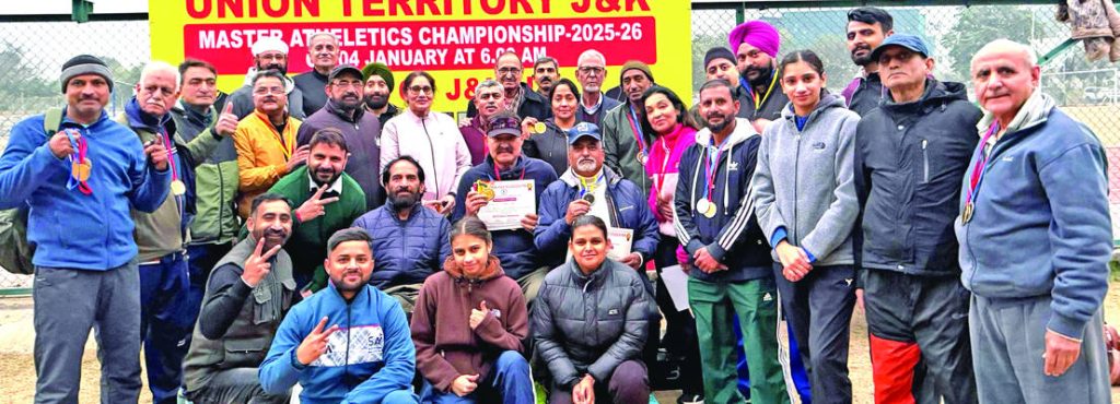 JAMMU: J&K UT Masters Athletics Championship 2025-26 was held at University of Jammu, Synthetic Athletic track, organised by J&K UT Masters Athletics Association under the aegis of J&K Sports council in collaboration with Directorate of Sports & Physical Education University of Jammu. On the valedictory function, Ravi Singh (Former Divisional Officer JKSSC) was the Chief Guest and B.R Chandan (Chairman) & Abdul Queem (President) was the Special Guests and Tarseem Basotra (General Secretary) & Rampaul Kapoor (Organizing Secretary) who felicitated the winners with merit certificates and medals.
