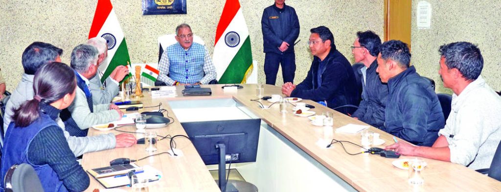 Lieutenant Governor of Ladakh, Kavinder Gupta chairing a meeting at Leh on Tuesday.