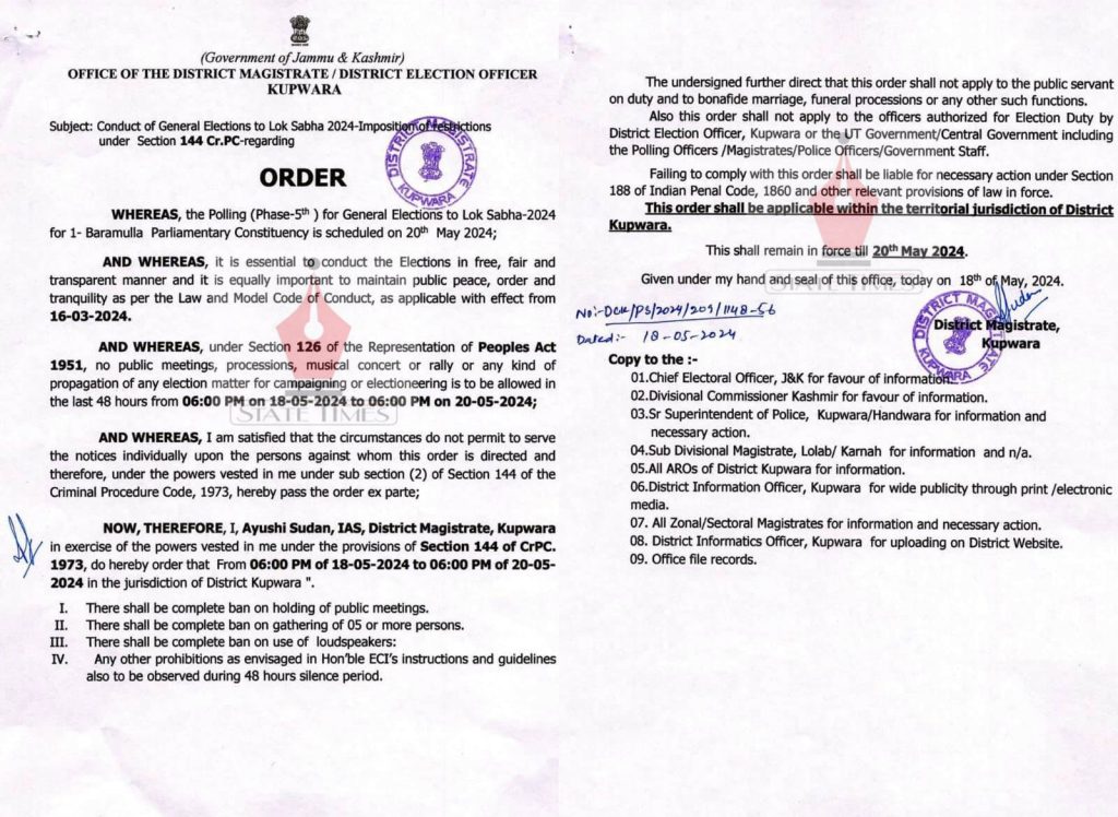 #LSElections2024: Restrictions imposed in Kupwara Image GalleryJammu and KashmirKashmir By statetimes_editor Last updated May 18, 2024 0 412 Share 0 412 Share FacebookTwitterGoogle+ReddItWhatsAppPinterestEmail