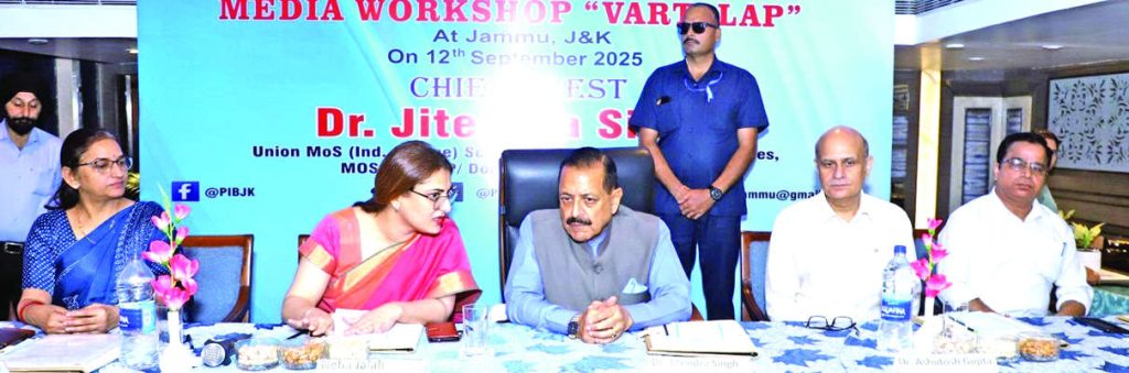 JAMMU: Union Minister Dr. Jitendra Singh on Friday said that media acts as an effective bridge between the Government and the people and has a pivotal role in spreading awareness about various government schemes and initiatives. Dr. Jitendra Singh was addressing media workshop ‘Vartalap’ as a Chief Guest, organised by Press Information Bureau, Ministry of Information & Broadcasting, Government of India, Jammu.