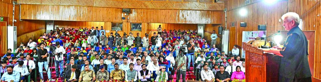 SRINAGAR: Lieutenant Governor Manoj Sinha on Saturday addressed the youth during an event “Hindi Rangmanch – Humari Bhasha, Humari Pehchaan” organized by Wadies Hindi Shiksha Samiti at Tagore Hall, Srinagar.