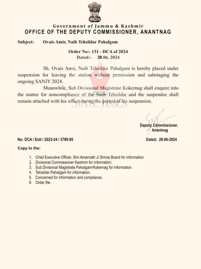 #Naib Tehsildar Pahalgam suspended for leaving station without permission Jammu and KashmirKashmirLatest News By statetimes_editor Last updated Jun 29, 2024 0 408 Share 0 408 Share FacebookTwitterGoogle+ReddItWhatsAppPinterestEmail