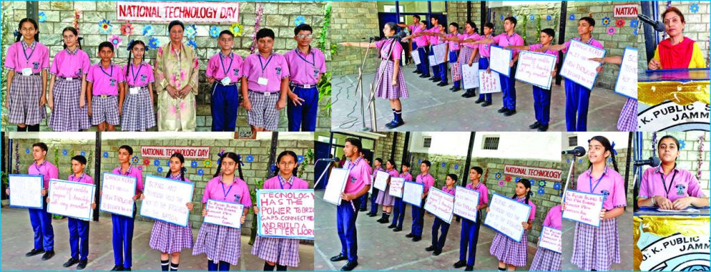 JAMMU: JK Public School, Panjtirthi, celebrated National Technology Day with great enthusiasm and patriotic fervour, highlighting India’s journey and achievements in the field of science and technology. Salochana Raina, the teacher Incharge of the celebration, explained that technology plays a crucial role in modern society. Everyone is touched by the power of technology in one way or the other way. She also talked about some famous Indian scientists and their discoveries.