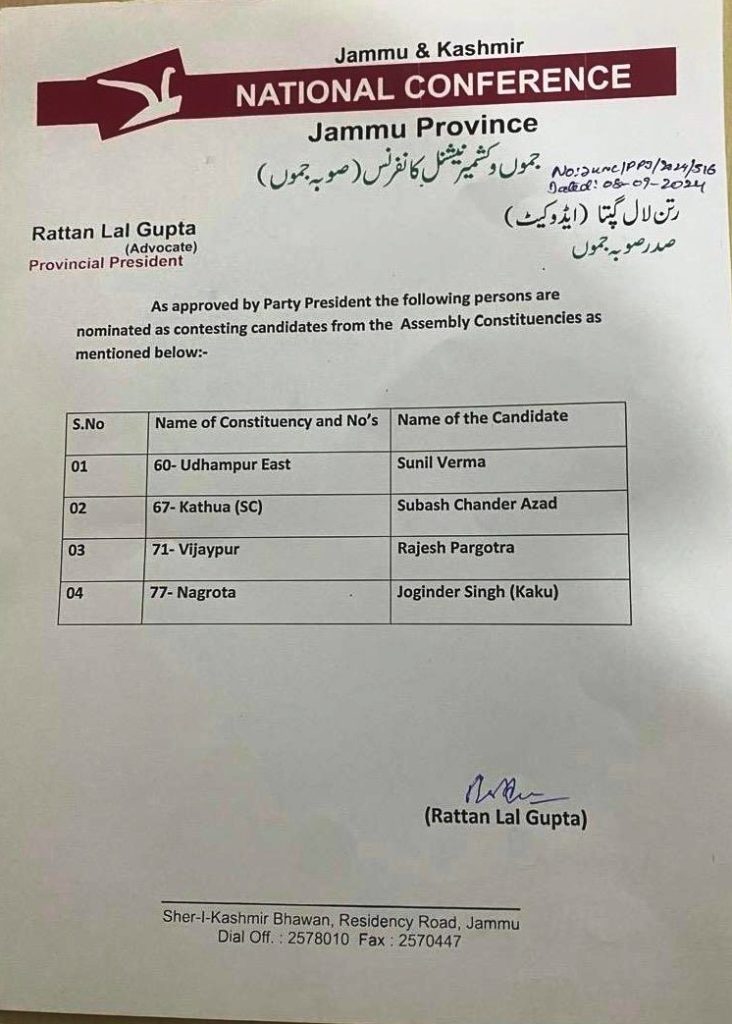 JAMMU: Ahead of the Assembly elections, the Jammu and Kashmir National Conference (JKNC) on Sunday announced its list of candidates for four key assembly constituencies, including Kathua, Nagrota, and Udhampur East.