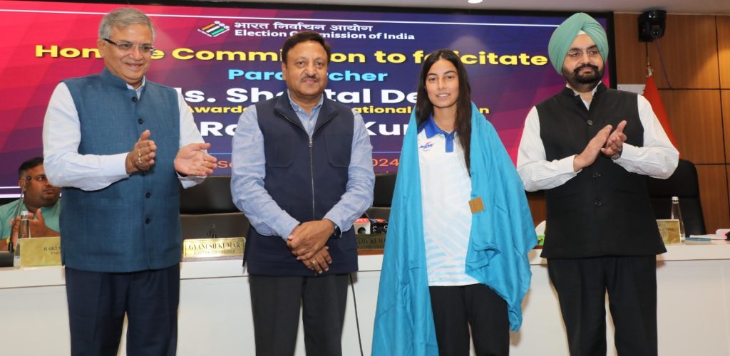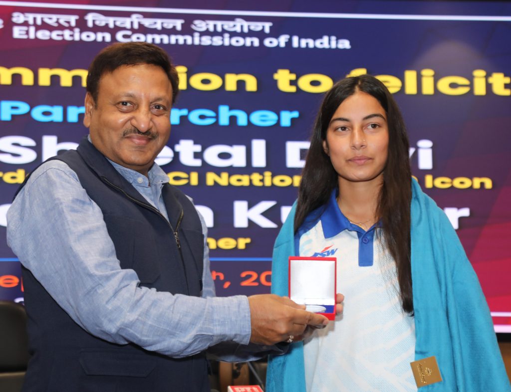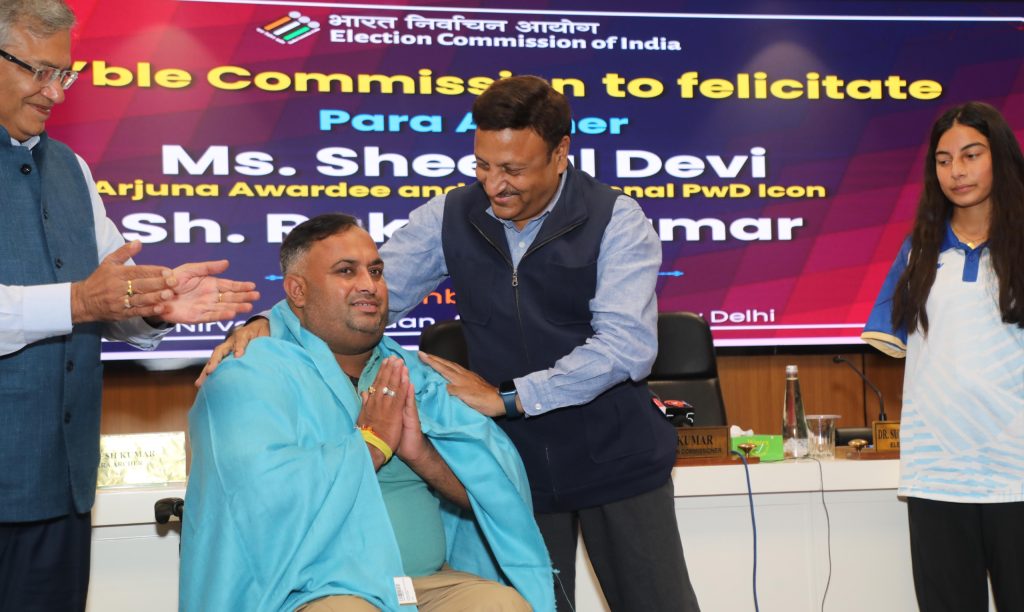 Paralympic archery champions Sheetal Devi and Rakesh Kumar team up to inspire voters nationwide as ECI’s national icons for Persons with Disabilities (PwDs). In an event organised today at Nirvachan Sadan, CEC Rajiv Kumar along with ECs Gynaesh Kumar and Dr. Sukhbir Singh Sandhu felicitated Arjuna Awardee and ECI’s national PwD icon, Sheetal Devi and her mixed doubles team partner Rakesh Kumar, in recognition of their outstanding achievement in winning a bronze medal in Archery at the Paris Summer Paralympics 2024. On the occasion, the Commission also announced Shri Rakesh Kumar, renowned paralympian as the ECI National icon for PwDs.