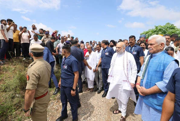 LG Manoj Sinha accompanying Home Minister Amit Shah to survey flood affected areas of Jammu.