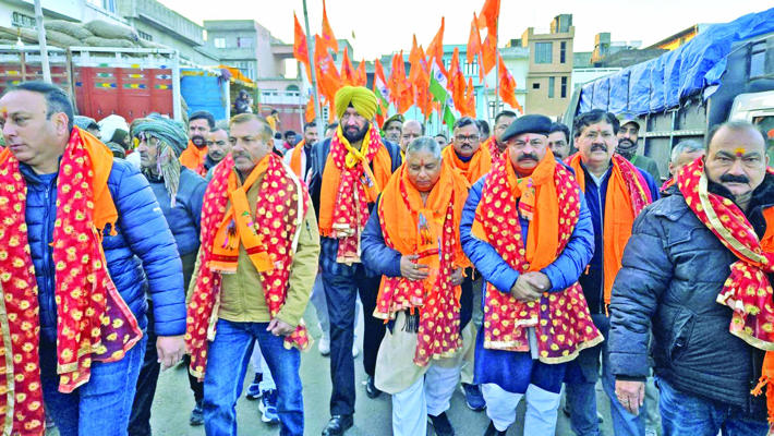 JAMMU: J&K BJP President Sat Sharma and MLA Jammu East, Yudhvir Sethi on Wednesday participated in the first anniversary celebrations of the Ram Temple consecration ceremony at the Fruit & Vegetable Market in Narwal, Jammu.