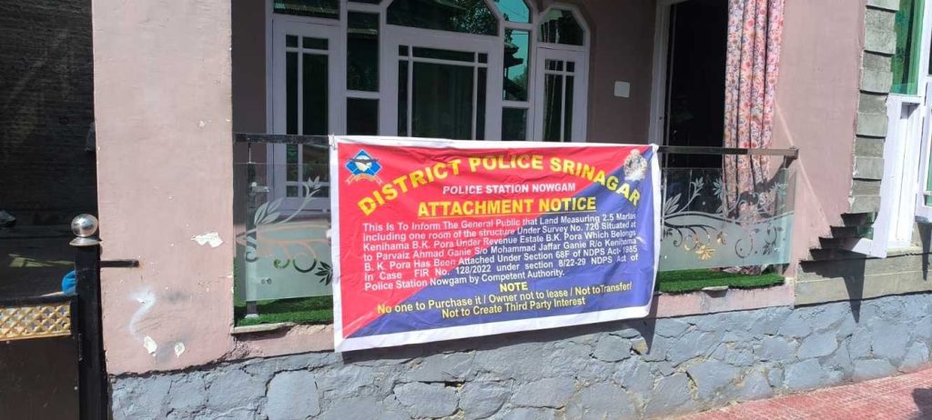 Police also attached properties belonging to three notorious drug peddlers in Pulwama’s Awantipora area.