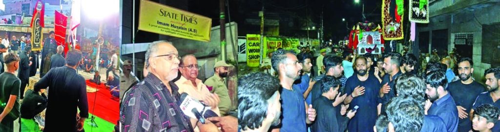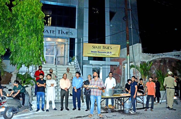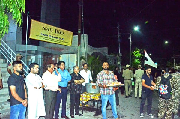 On reaching STATE TIMES road, the Editor-in-Chief Raj Daluja, joined by the staffers, offered fruit juice to the mourners, carrying Taziyas, symbolizing replica of the mausoleum of Imam Hussain (AS), who attained martyrdom in the battle of Karbala. Fruit juice stalls were laid in front of the STATE TIMES head office at Ambphalla. Raj Daluja paid tributes to Imam Hussain (AS), saying Muharram conveys the message of adherence to truth and steadfastness against injustice.
