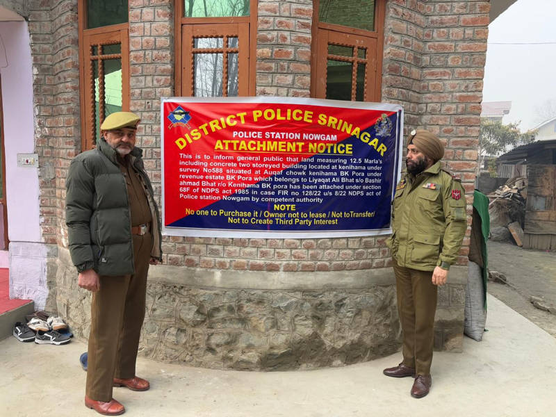 The police in Srinagar attached a double-storey residential house along with 12.5 marlas of land, valued at approximately Rs 1.6 crore, belonging to notorious drug peddler Liyaqat Ali Bhat, a police spokesman said.