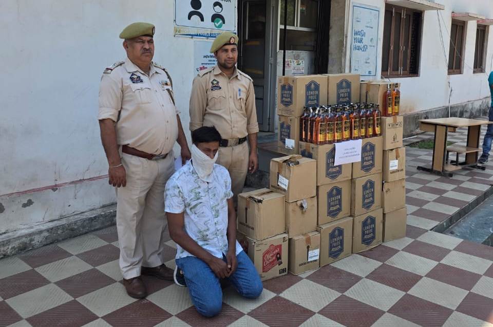 Ramnagar Police team led by SHO during routine naka near bus stand Ramnagar intercepted one vehicle (Ciaz Car) CH01CC 8684. On checking, huge quantity of illicit liquor 21 boxes (298 bottles of 750ml each) were recovered from the said vehicle and one inter-state bottlegger (driver) namely Mane Gopal Dada Bha son of Dada Bhau Mane resident of Pine at present Chandigarh has been arrested on spot.
