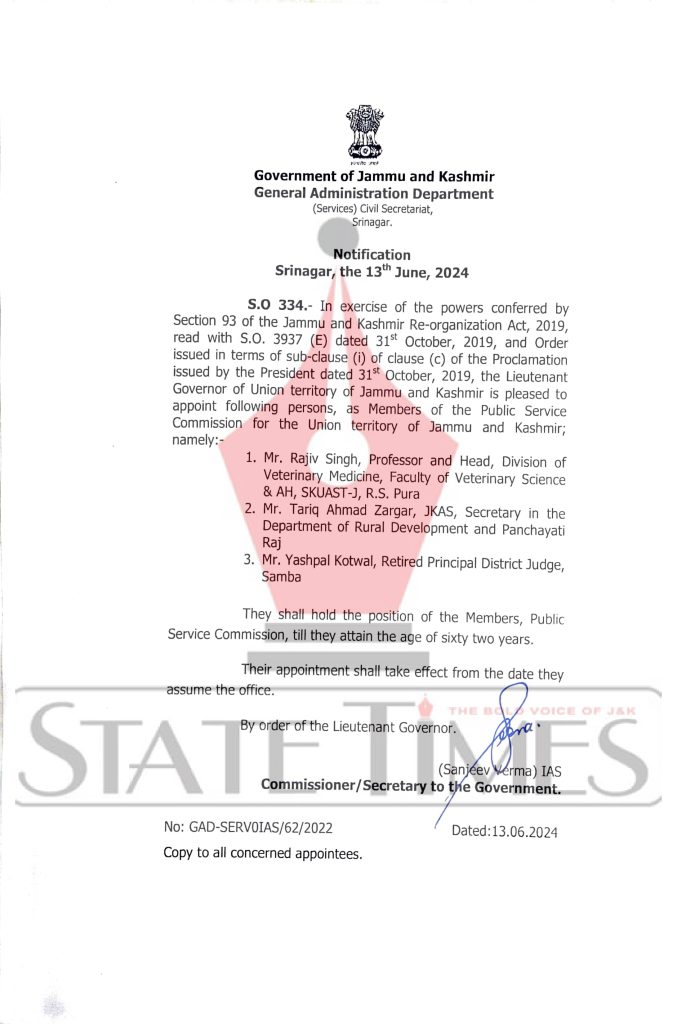 Retired Judge among three others appointed as Members of Jammu and Kashmir Public Services Commission (JKPSC). Image GalleryJammuJammu and Kashmir By statetimes_editor Last updated Jun 14, 2024 0 396 Share 0 396 Share FacebookTwitterGoogle+ReddItWhatsAppPinterestEmail
