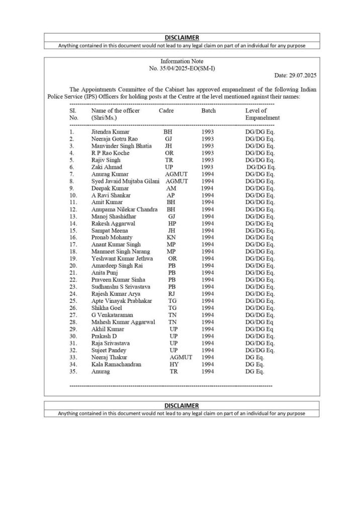 The Appointments Committee of the Cabinet (ACC) has approved empanelment of 35 Indian Police Service (IPS) officers belonging to 1993 and 1994 batches for holding Director General/Equivalent posts at the Centre.