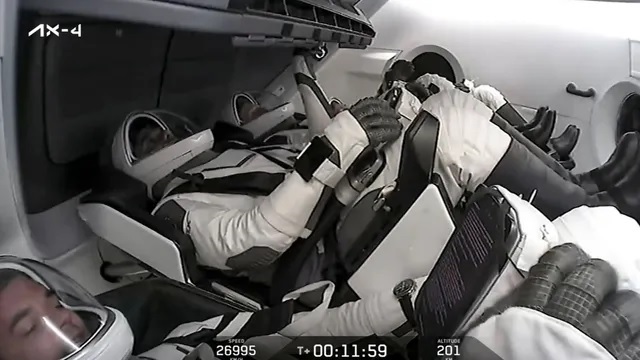 The footage beamed by cameras from inside the crew capsule showed the four astronauts strapped into their cabin, seated side-by-side in helmeted white-and-black flight suits.