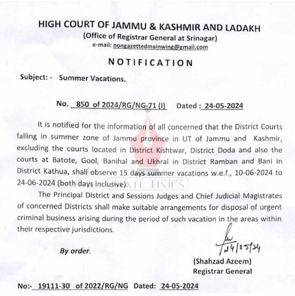 Summer Vacation announced for District Courts in Jammu Province from June 10 to 24 CourtImage GalleryJammu By statetimes_editor Last updated May 24, 2024 0 4,014 Share 0 4,014 Share FacebookTwitterGoogle+ReddItWhatsAppPinterestEmail