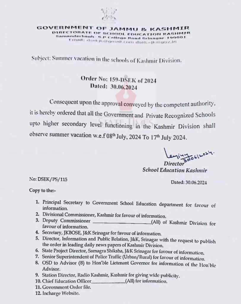 Summer Vacations in Kashmir Division’s Schools from July 8 to 17 Jammu and KashmirKashmirLatest News By statetimes_editor Last updated Jun 30, 2024 0 3,276 Share 0 3,276 Share FacebookTwitterGoogle+ReddItWhatsAppPinterestEmail