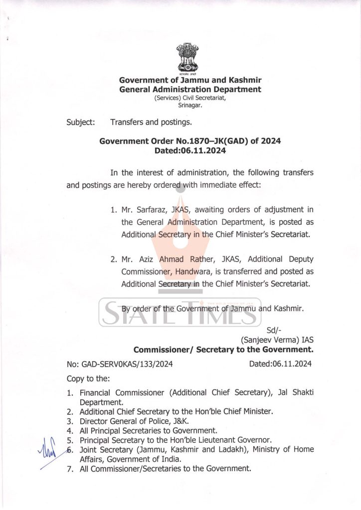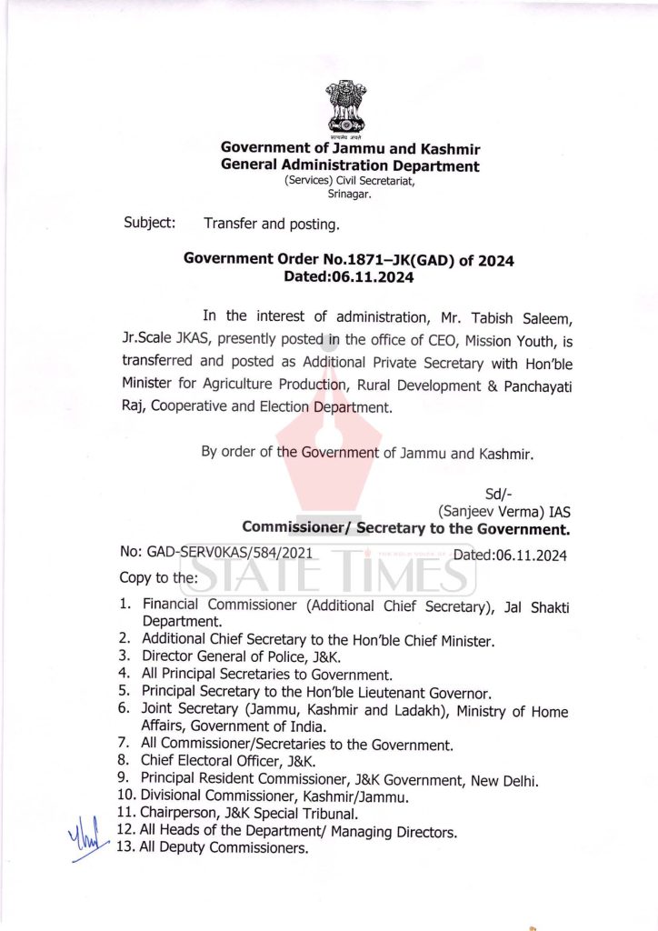 In the interest of administration, Tabish Saleem, Jr. Scale JKAS, presently posted in the office of CEO, Mission youth, is transferred and posted as Additional private Secretary with Minister for Agriculture Production, Rural Development & Panchayati Raj, Cooperative and Election Department, read complete order below.