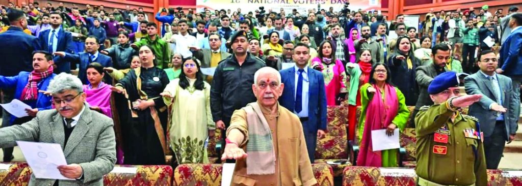 Lieutenant Governor Manoj Sinha administering National Voters’ Day pledge during 16th National Voters’ Day celebrations in Jammu.