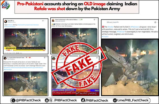 One of the most prominent examples is a viral image falsely claiming that the Pakistan Army had shot down an Indian Rafale jet near Bahawalpur. The image, however, was debunked by PIB Fact Check, which confirmed that it was actually from a MiG-21 crash in Moga, Punjab, in 2021 — entirely unrelated to current events.